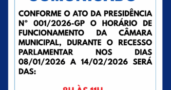 COMUNICADO: HORÁRIO DE FUNCIONAMENTO DURANTE O RECESSO DA CÂMARA MUNICIPAL DE RONDON DO PARÁ.